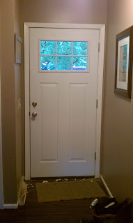 My dad has given Jared energy and productivity when he was flat out exhausted. Together, they installed a new front door along with new trim, bought and moved in a new rocker for the living room for Baby Brown, finished painting the wainscoting in the nursery, moved and finished the outlets in the nursery, put in new blinds in the nursery, touched up in the nursery, moved some furniture into the nursery, hung all new drywall in the previously un-finished section of the basement that will soon become our office/sewing area and taped and mudded the drywall. They had to wait for it to dry so they decided to rest (and my dad watched the Colt's game).
